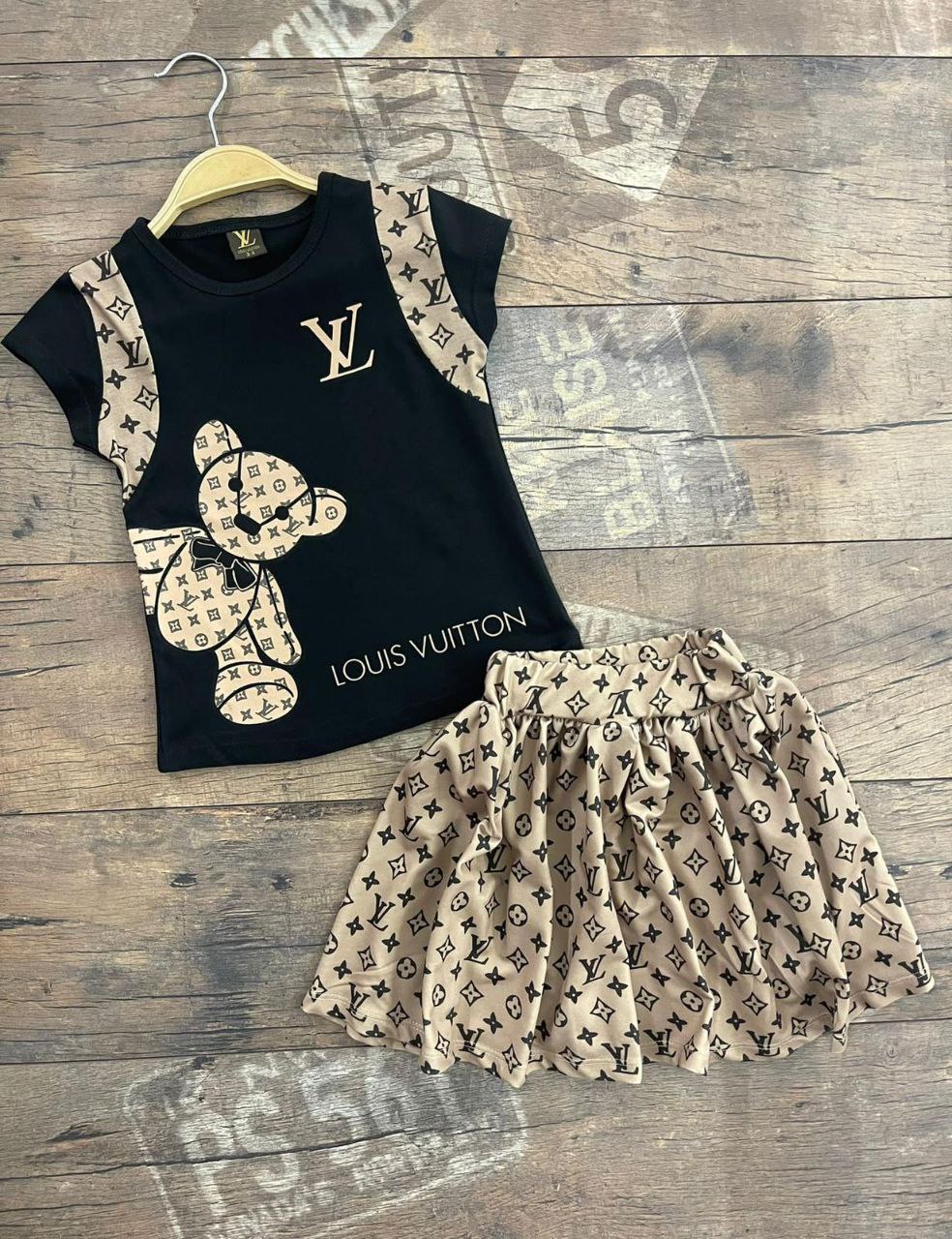 ست دخترانه دو تيكه تدي با طرح لویی ویتون - پارچه نخی و کیفیت عالی مناسب برای دختر بچه های سنین 4 تا 10سال.